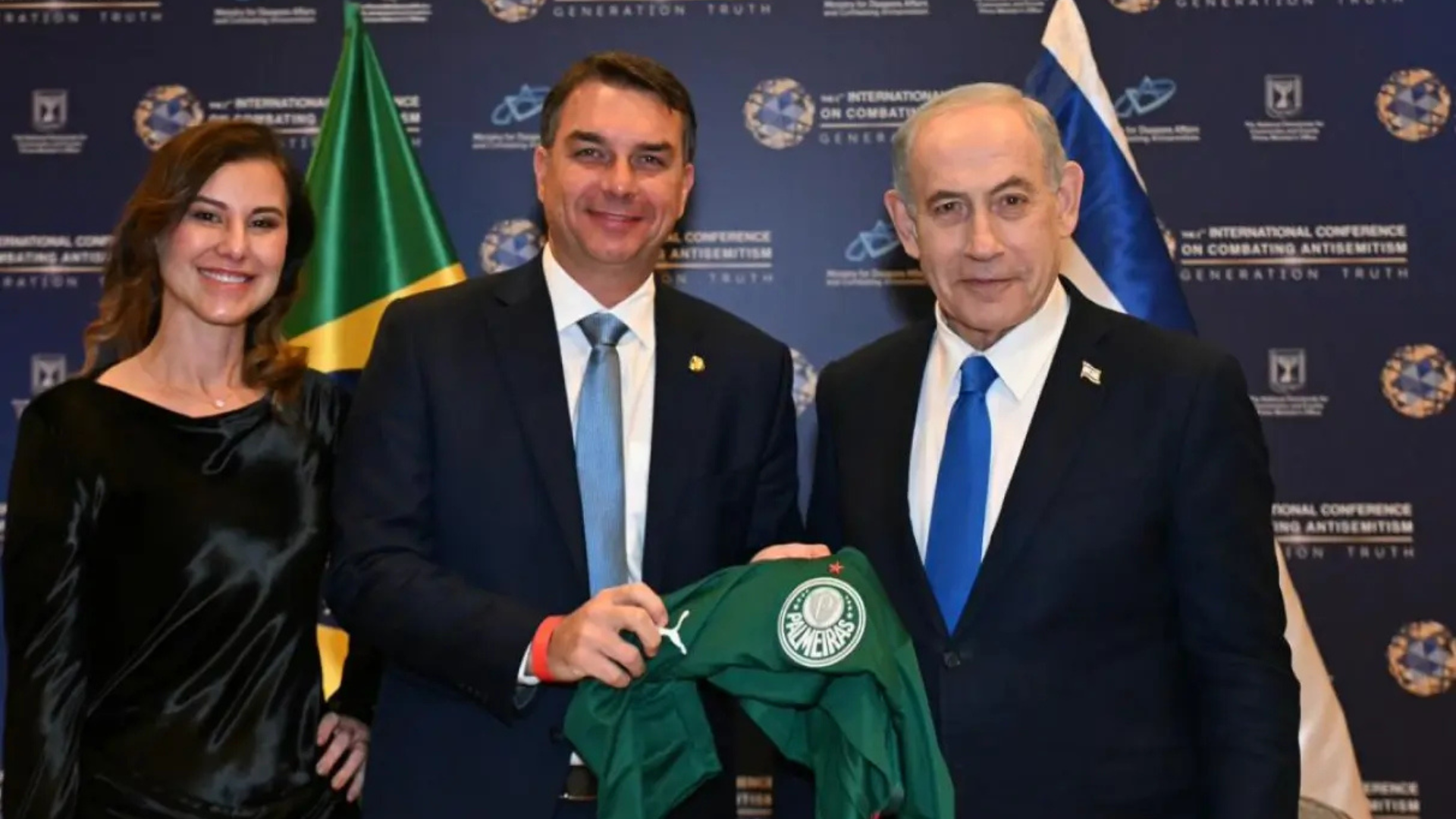 Na abertura da conferência, o primeiro-ministro de Israel, Benjamin Netanyahu, citou Flávio e Eduardo Bolsonaro como convidados ilustres: