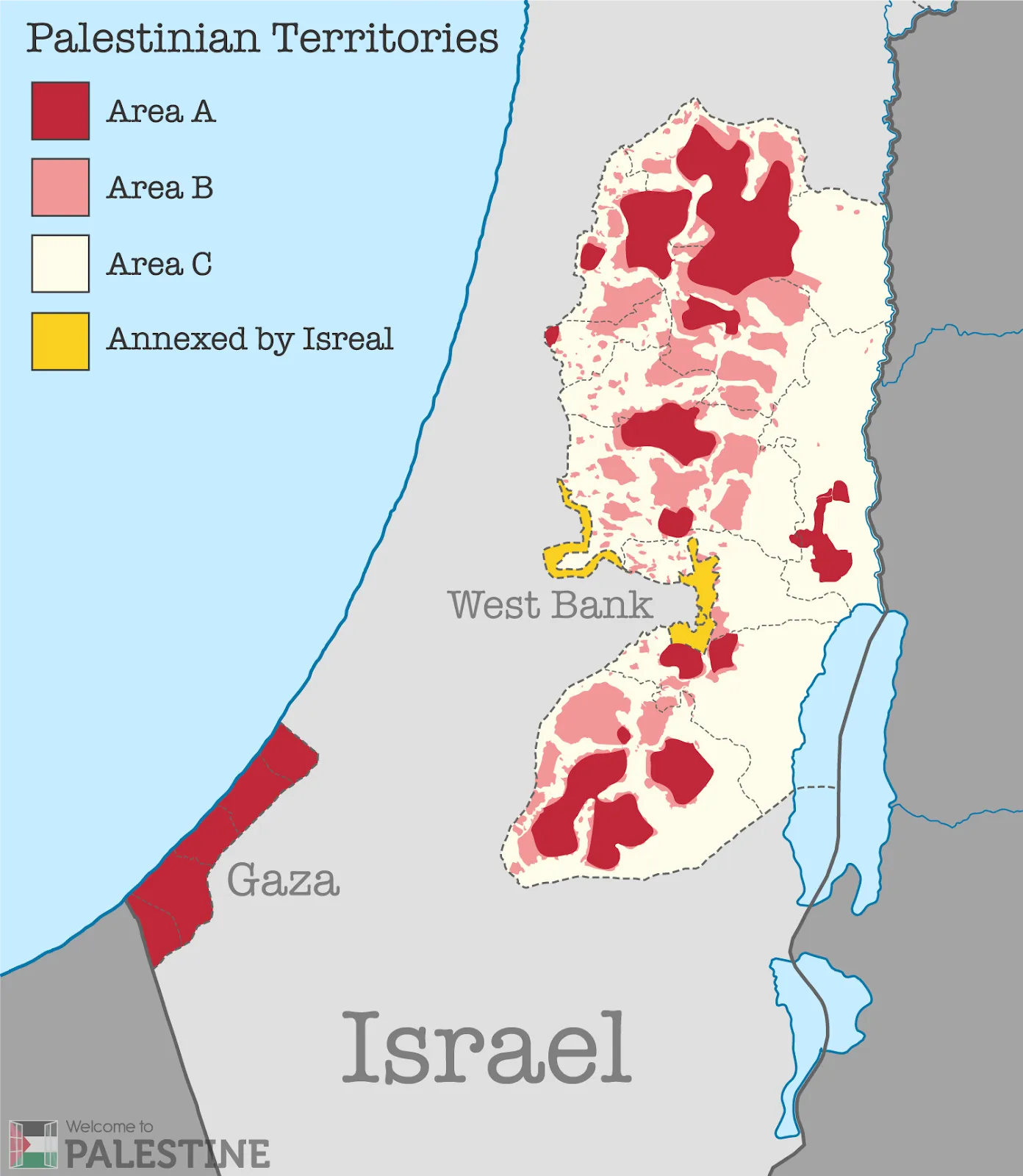 A primeira fatia da região é conhecida como Área A, onde a ANP controla totalmente o zoneamento urbano e a segurança pública; o segundo setor dentro do território palestino é chamado de Área B; nessas regiões, há um controle conjunto de Israel e da ANP e, por fim, há a Área C, controlada por Israel e repleta de assentamentos judaicos.